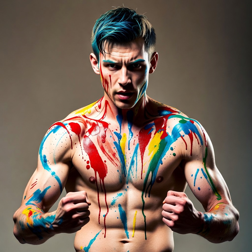 White, abs, arms, art paint, athletic build, blue hair, blue paint, body paint, boxing pose, chest, colorful paint, dripping paint, fighter pose, fists clenched, gray background, green paint, intense expression, male, muscular, paint splatter, red paint, shirtless, strong man, studio photo, vibrant colors, yellow paint, man