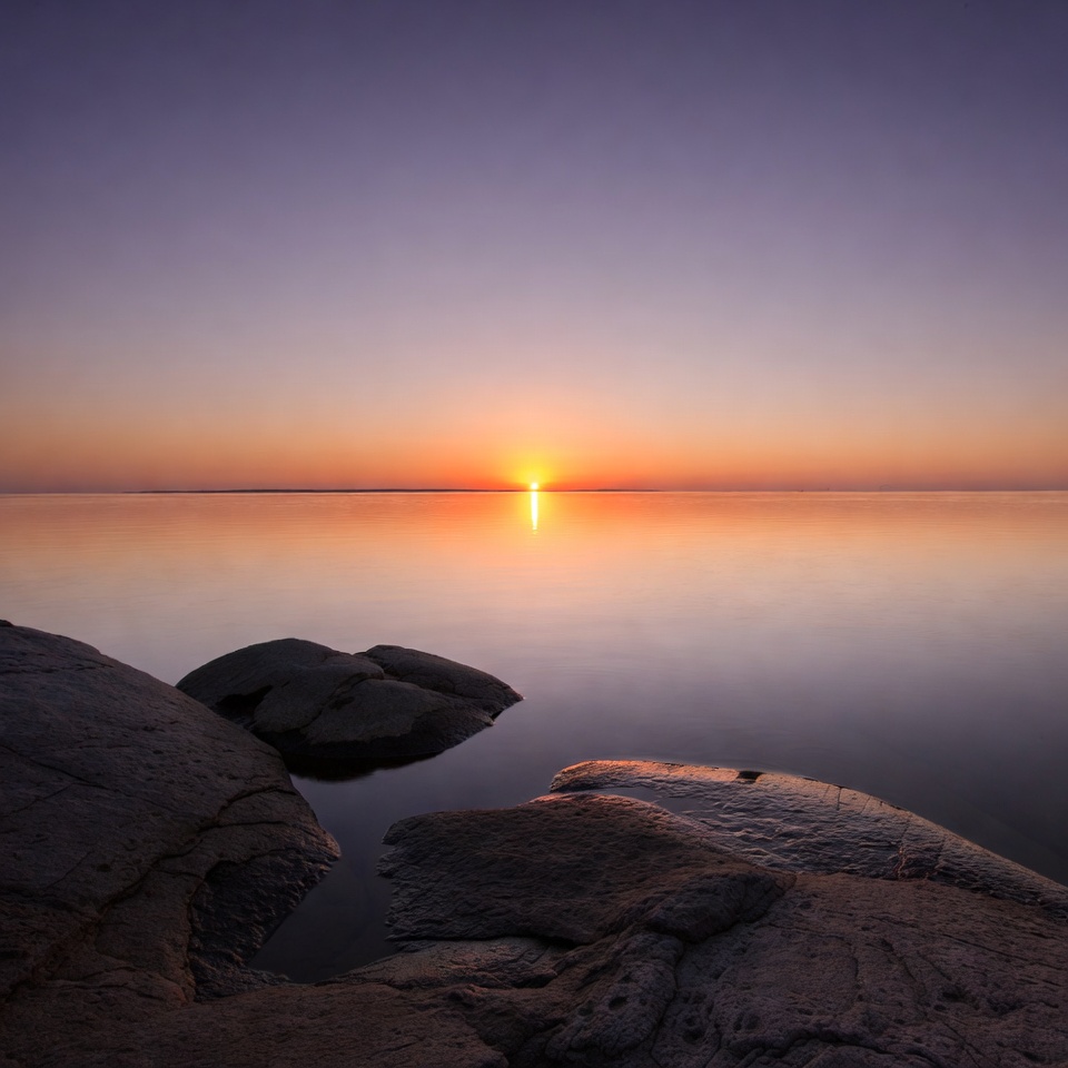 calm water, dusk, foreground rocks, golden hour, horizon, lake, landscape, mirrored sky, nature, orange sky, outdoor, peaceful water, purple sky, reflection, rocks, scenic view, serene lake, smooth surface, sunlight, tranquil, water, sunset