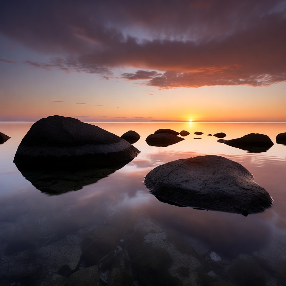 boulders, calm water, clouds, dusk, evening sky, horizon, lake, landscape, mirror reflection, nature, orange sky, purple sky, reflection, rocks, seascape, serene water, sky, stone reflections, sunrise, water, sunset