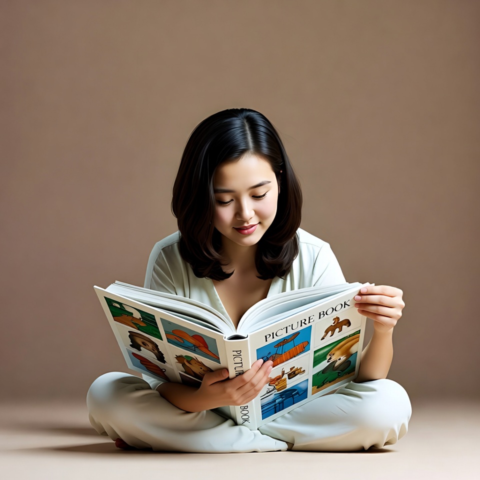A young Asian woman with shoulder-length black hair sits cross-legged on a beige floor, reading an open colorful picture book. She wears a white outfit and holds the book with both hands, focusing intently on the pages filled with illustrations. The background is a plain beige studio setting.