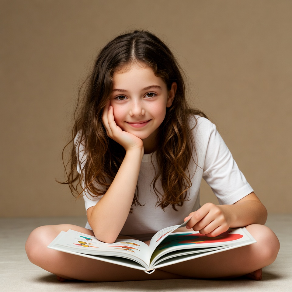 A young girl with long wavy brown hair sits cross-legged on the floor, holding an open colorful book in front of her. She wears a white t-shirt and rests her chin on one hand while smiling happily at the camera. The background is a plain beige color.