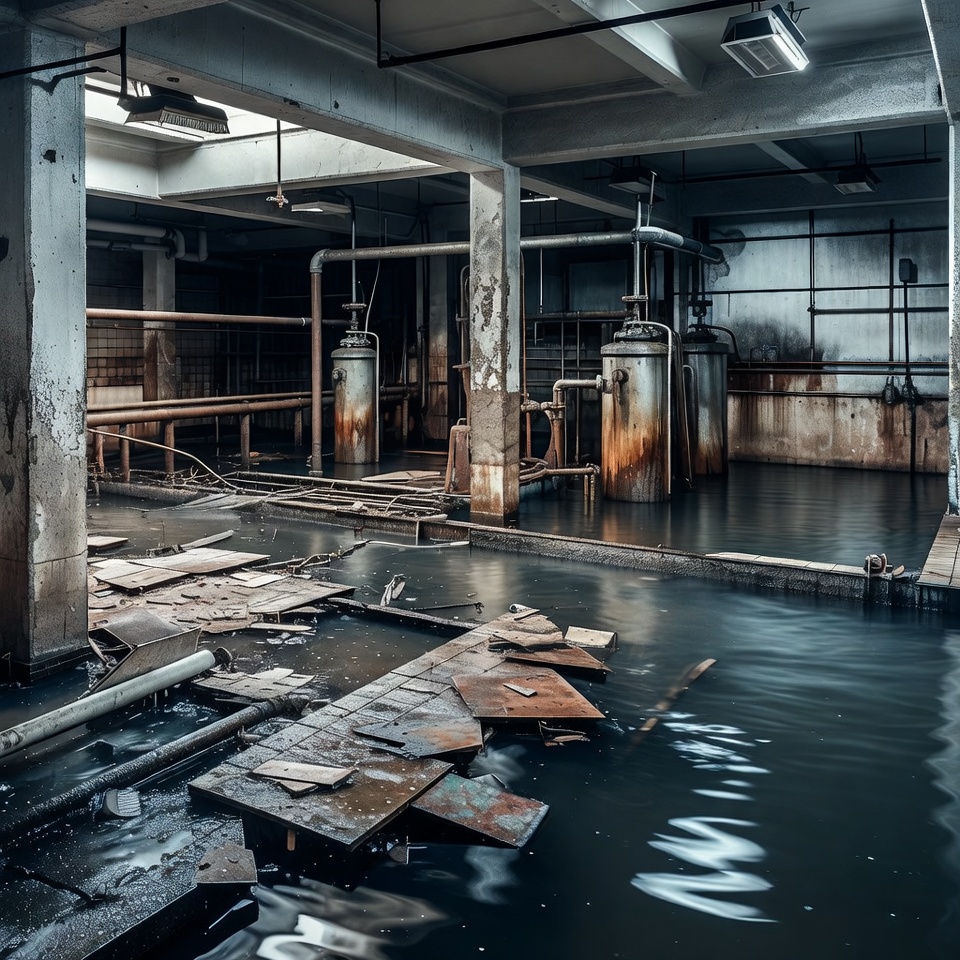 abandoned building, broken planks, concrete pillars, corroded metal, dark water, debris, decay, derelict site, dimly lit, exposed beams, factory interior, flooded building, flooded floor, industrial decay, industrial equipment, industrial ruin, metal tanks, old factory, ruined structure, rust, rusted pipes, urban exploration, warehouse, water damage, water flood, abandoned factory