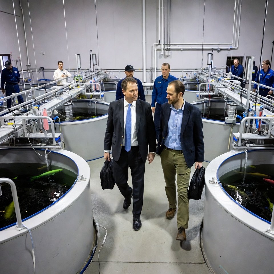 Two men in business attire walk between large circular fish tanks filled with colorful fish in an industrial aquaculture facility. Several other men in uniforms and casual clothes stand nearby observing the tanks. The spacious warehouse features white walls, metal railings, and multiple large round tanks.