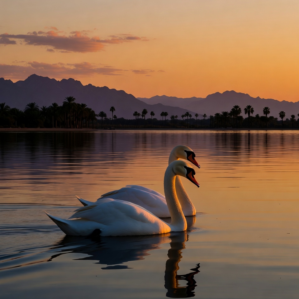 Two white swans swim gracefully on a calm lake during sunset, with their reflections visible in the water. Palm trees line the shore, and jagged mountains rise in the background under a colorful orange and pink sky.