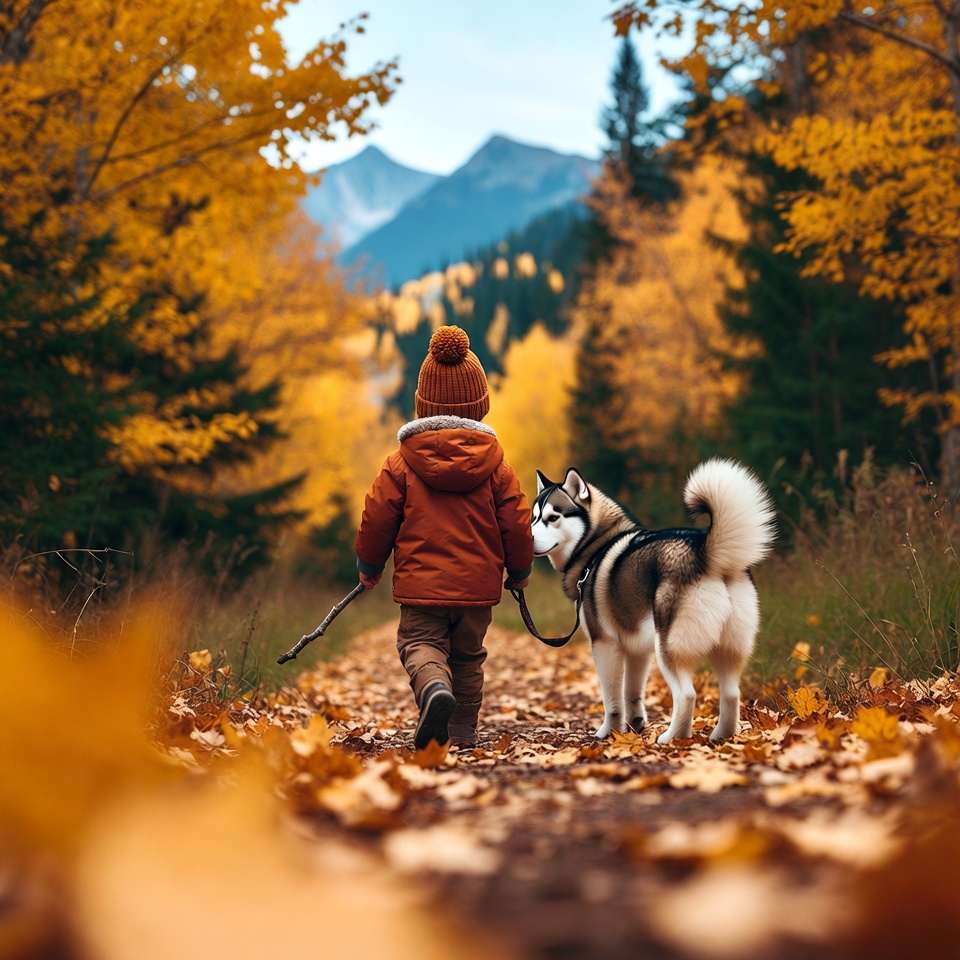 Siberian Husky, autumn, beanie hat, blue sky, child, dog, fall leaves, forest path, golden foliage, hiking, isolated background, mountains, nature, orange jacket, outdoors, pet, snow mountains, stick, trail, walking leash, woods, yellow trees, boy