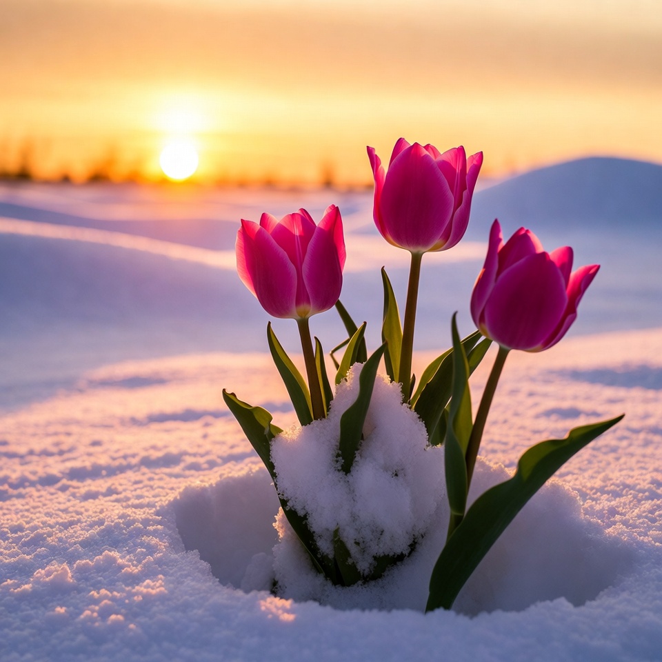 bloom, cluster, cold, flowers, fresh snow, frosty, frozen, garden, golden hour, green stems, landscape, nature, orange sky, outdoor, petals, snow, snowy mound, spring flowers, sunlight, sunrise, sunset, tulips, vibrant, winter, pink tulips