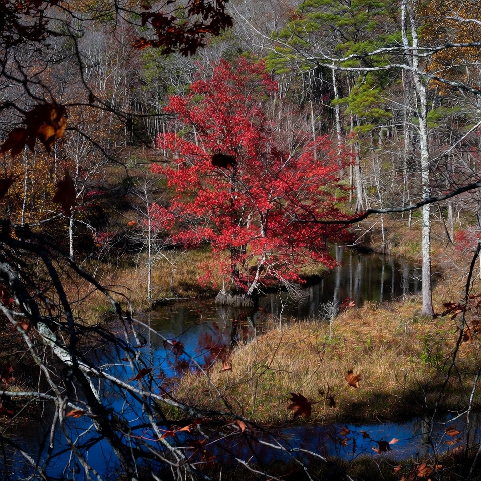 A vibrant red tree stands prominently beside a calm stream in an autumn forest. Surrounding trees display shades of red, orange, and bare branches, with foreground branches framing the scene. Reflections of the foliage and water create a serene natural landscape.