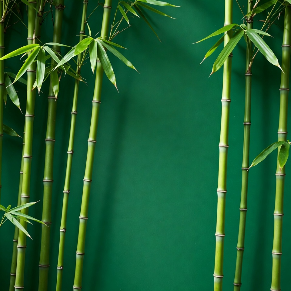Tall green bamboo stalks with slender leaves stand clustered against a solid green background. The bamboo shoots feature segmented stems and feathery foliage. The image provides ample negative space for overlay use.