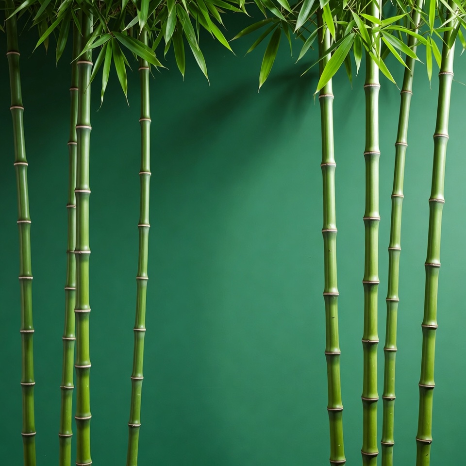 Several tall green bamboo stalks with slender leaves stand against a solid green background. The bamboo is arranged in a cluster, creating a natural vertical pattern. The image features an isolated view of the plants with no other elements.