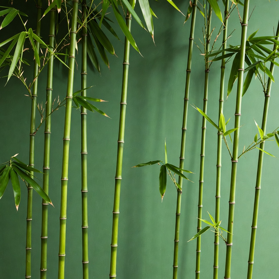 Several tall green bamboo stalks with slender leaves stand upright against a solid green background. The bamboo shoots vary slightly in height and thickness, creating a natural cluster. Shadows add depth to the isolated composition.