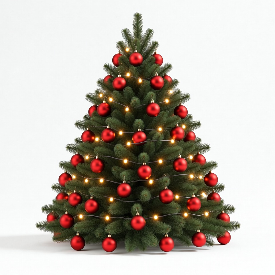 3D render, Christmas, baubles, celebration, decoration, evergreen, festive, fir tree, holiday decoration, holidays, illuminated tree, isolated background, lights, pine tree, red balls, red ornaments, white background, white lights, winter, Christmas tree