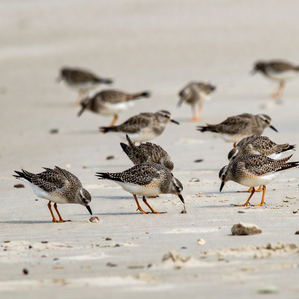 beach, birds, brown plumage, coastal, feeding birds, flock, foraging, group birds, nature, ocean shore, orange legs, plovers, sand, sandy beach, shorebirds, small birds, speckled feathers, white underparts, wildlife, sanderlings