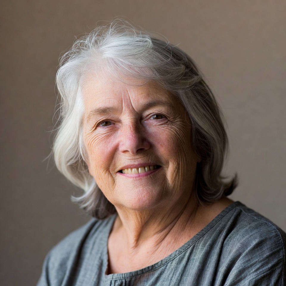 An elderly woman with shoulder-length silver-gray hair smiles warmly at the camera. She has light skin, blue eyes, and wears a gray top. The portrait is set against a plain beige background.