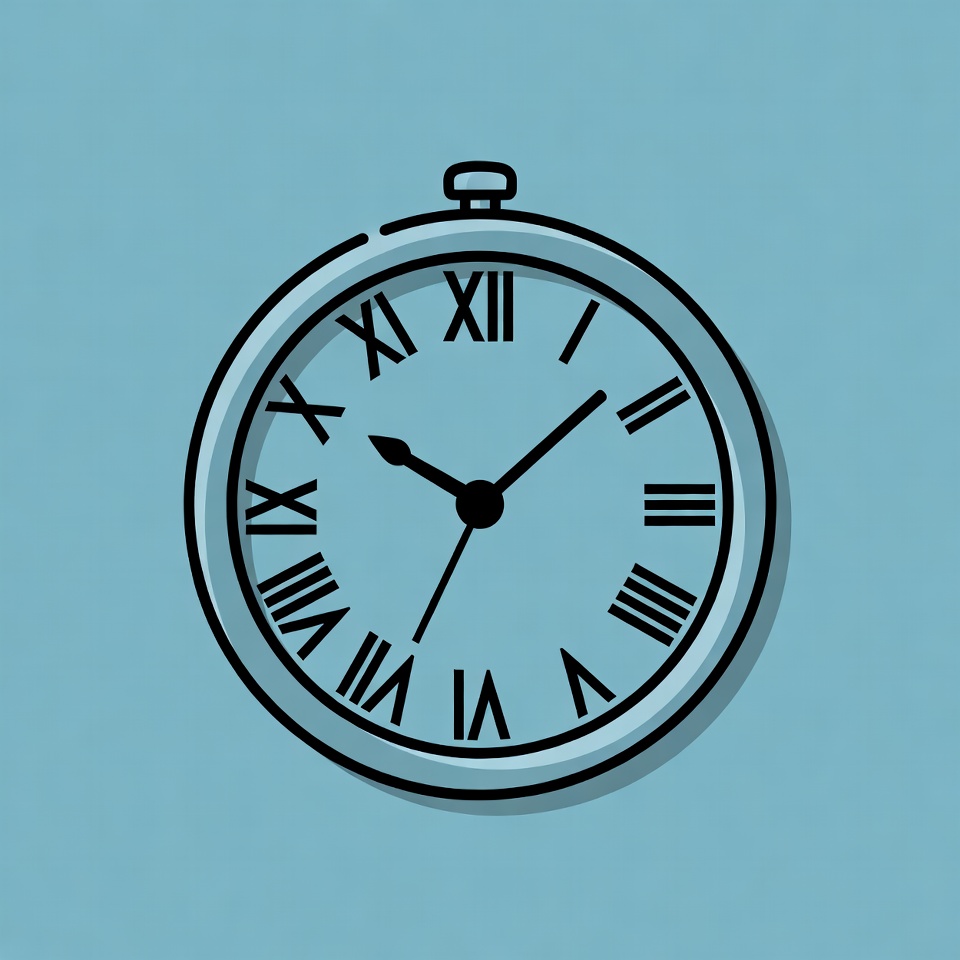A simple line art illustration of a round pocket watch with Roman numerals on a solid blue background. The clock hands point to approximately 10:08. It features a chain attached to the top.
