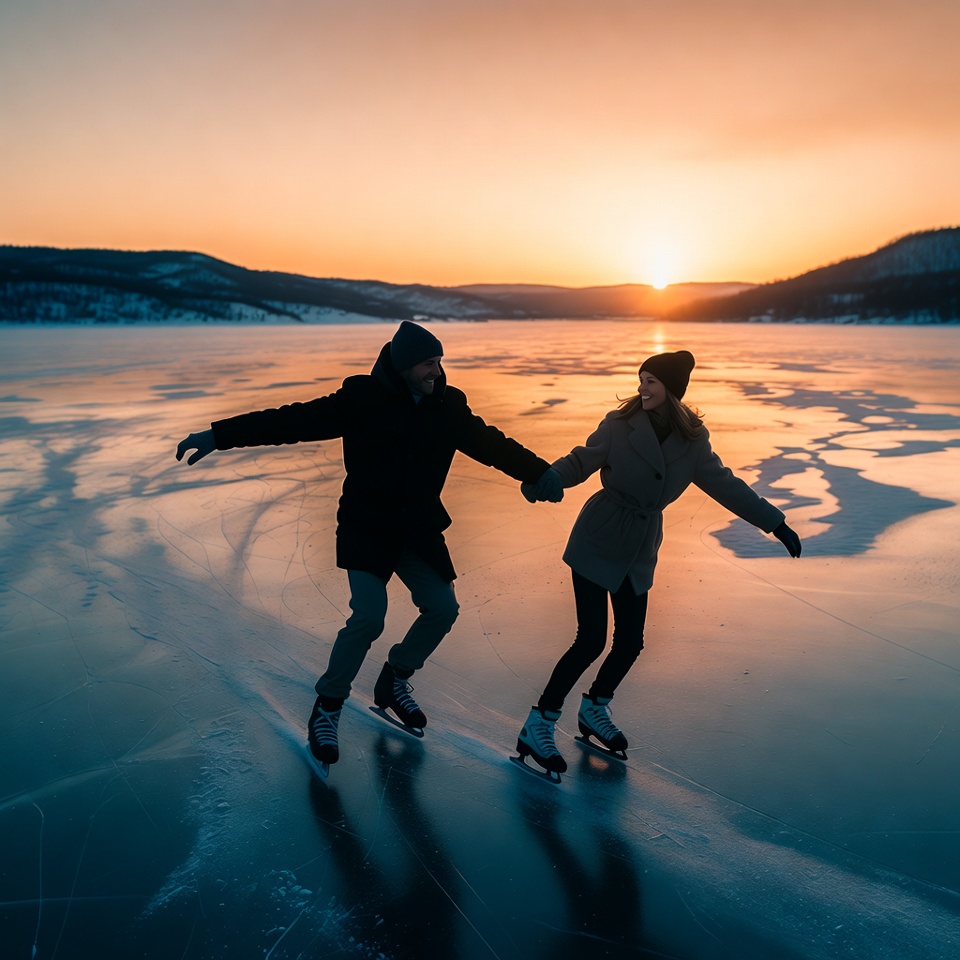 A man and woman hold hands while ice skating on a frozen lake during sunset. They wear winter coats, beanies, and skates, silhouetted against the orange sky and snowy hills. The ice surface shows skate tracks around them.