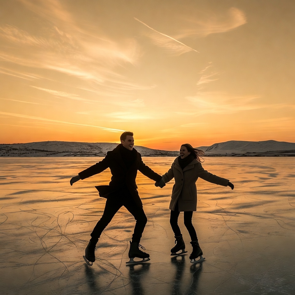 A man and woman hold hands while ice skating on a frozen lake at sunset. They wear winter coats and skates, silhouetted against the orange sky and snowy hills. The scene features smooth ice with skate tracks and a distant airplane trail.