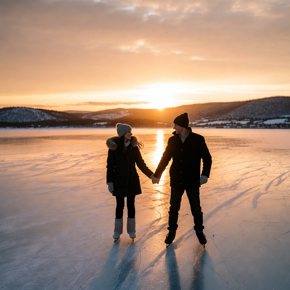 A man and woman hold hands while ice skating on a frozen lake during sunset. They wear dark winter coats, beanies, and skates, with snowy hills and mountains in the background. The golden sunlight reflects off the ice, creating a scenic winter landscape.