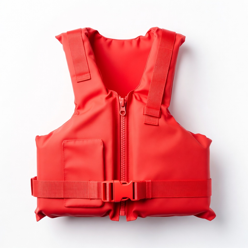 buckles, buoyancy aid, child safety, children's life jacket, flotation device, front view, isolated background, pockets, red life vest, red vest, safety vest, straps, swimming vest, vest, water safety, zipper, life jacket