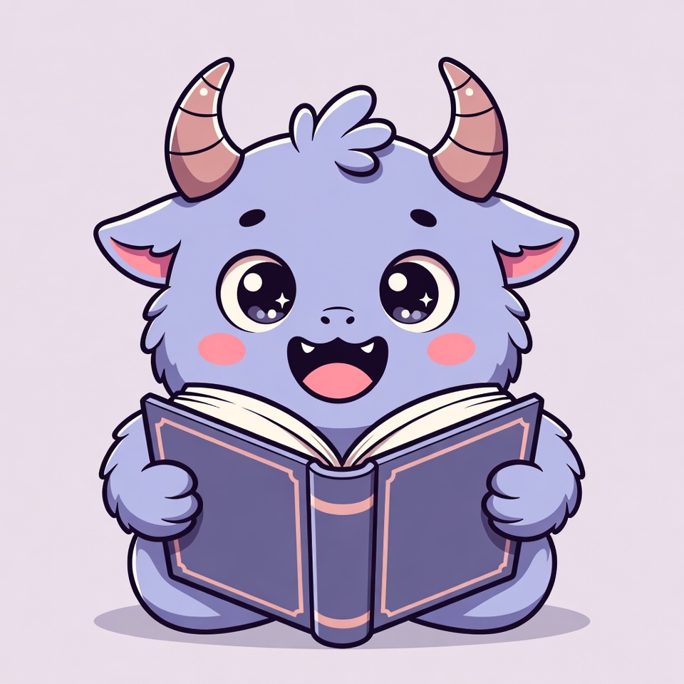 A fluffy blue cartoon goat with horns and big sparkling eyes happily reads an open book. It sits on a plain background, holding the book with its paws and showing a wide smile with rosy cheeks. The illustration features a kawaii style with vibrant purple tones.