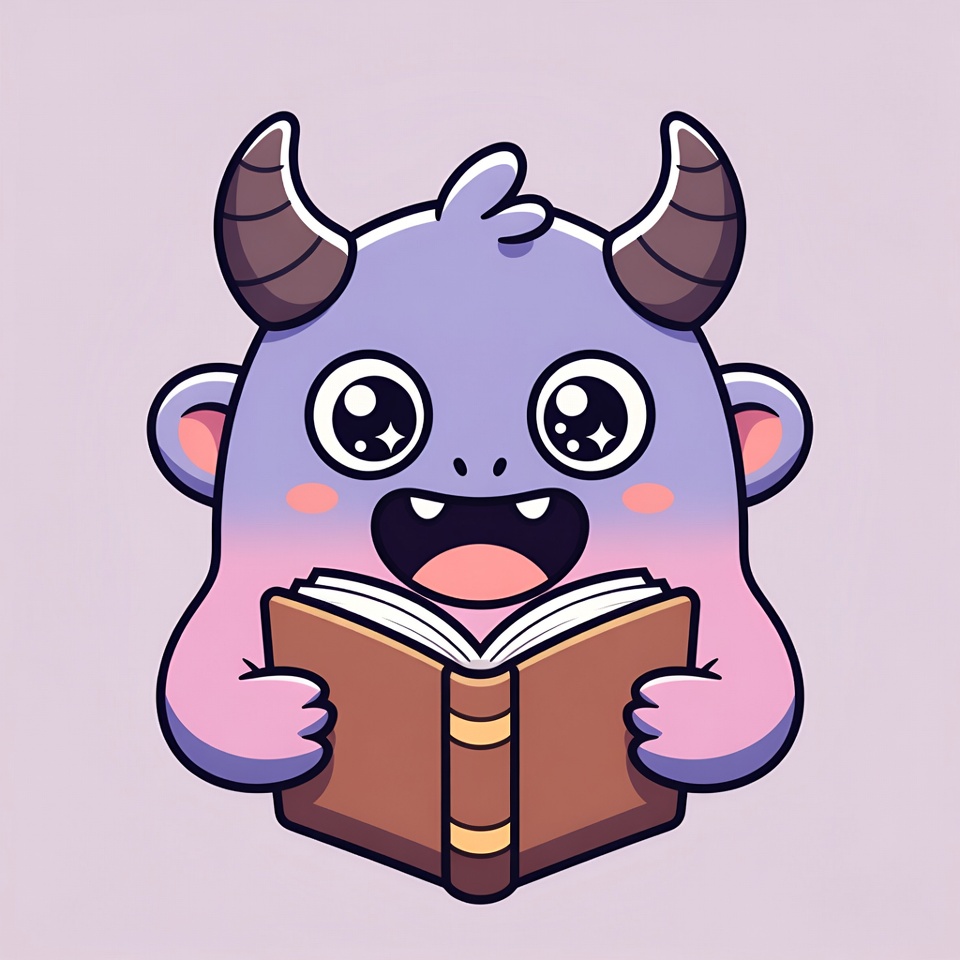 A kawaii-style purple monster with horns and big sparkling eyes happily reads an open brown book. It has a wide smile showing sharp teeth and blushes on its cheeks. The illustration is on a light purple isolated background.