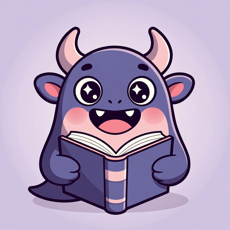 A cute cartoon purple monster with horns and big sparkling eyes happily reads an open book. It has pink cheeks, a wide smile with teeth showing, and small ears. The illustration features a simple purple background.
