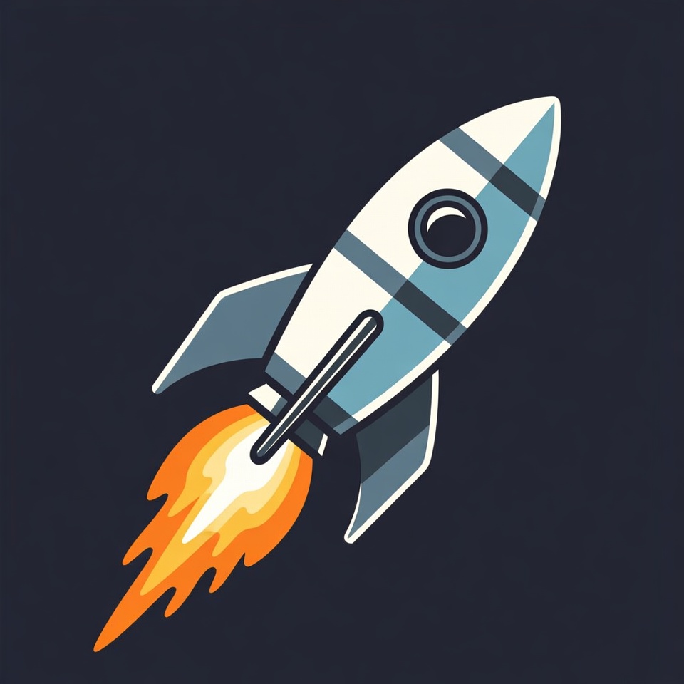 A simple flat illustration of a white and blue rocket launching upwards against a dark background. Bright orange flames and smoke trail from its engines. The design features clean lines and a circular window on the rocket body.