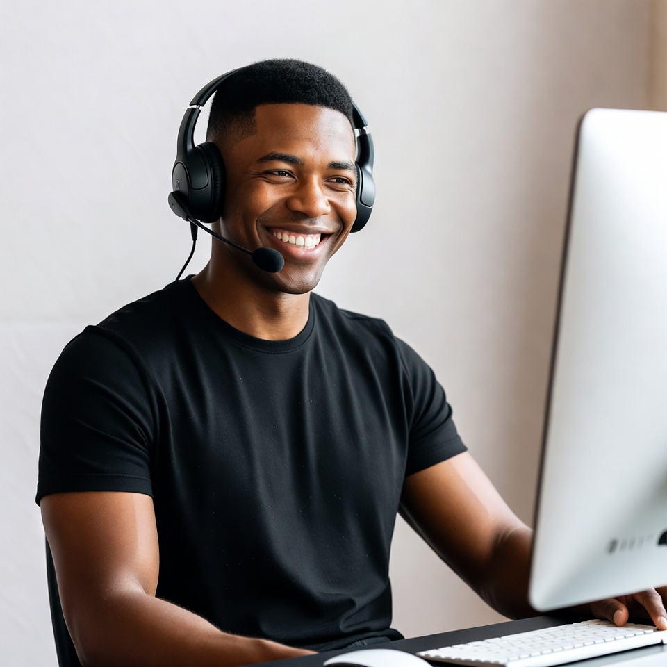 A young African-American man with short black hair smiles happily while wearing a black headset with microphone. He sits at a desk in front of a large white monitor and keyboard, dressed in a black t-shirt. His hands are positioned near the keyboard in a well-lit room with a plain background.