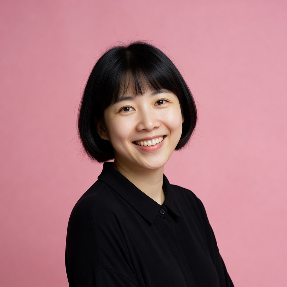 A young Asian woman with straight black bob haircut and bangs smiles warmly at the camera. She wears a black collared shirt and stands against a solid pink background. Her expression is joyful with bright eyes and a gentle smile.