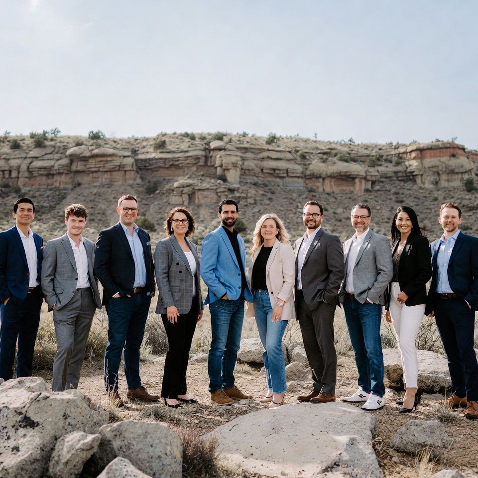 A diverse group of nine professionals in business suits stands together on rocky ground with a red rock canyon and blue sky in the background. The team includes men and women of various ethnicities, wearing formal attire like suits, blazers, and dresses. They pose confidently outdoors in a scenic desert landscape.