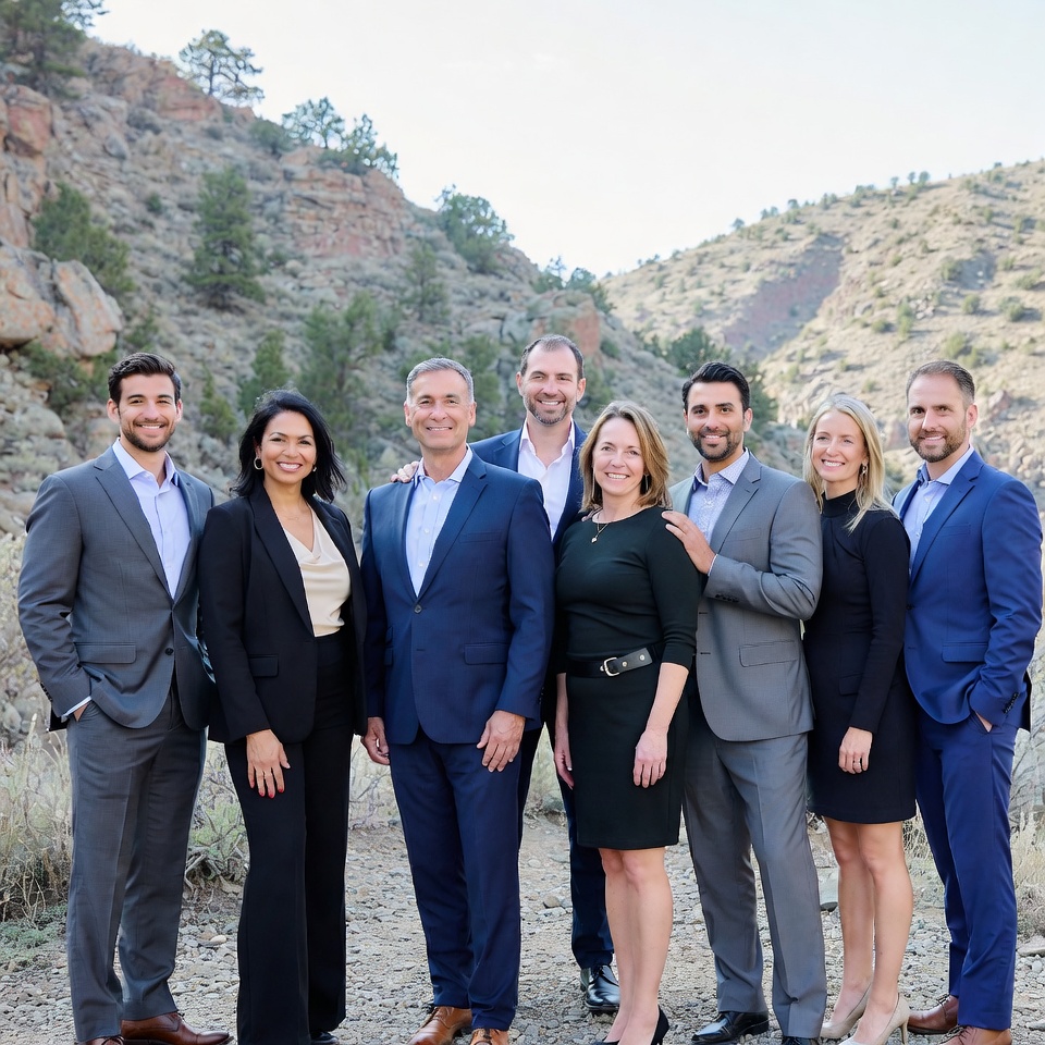 A diverse group of eight professionals in business suits stands together on a dirt path with red rock cliffs and pine trees in the background. The men wear suits in gray, navy, and blue, while the women wear black dresses, skirts, and blazers. They smile confidently at the camera under a clear sky.