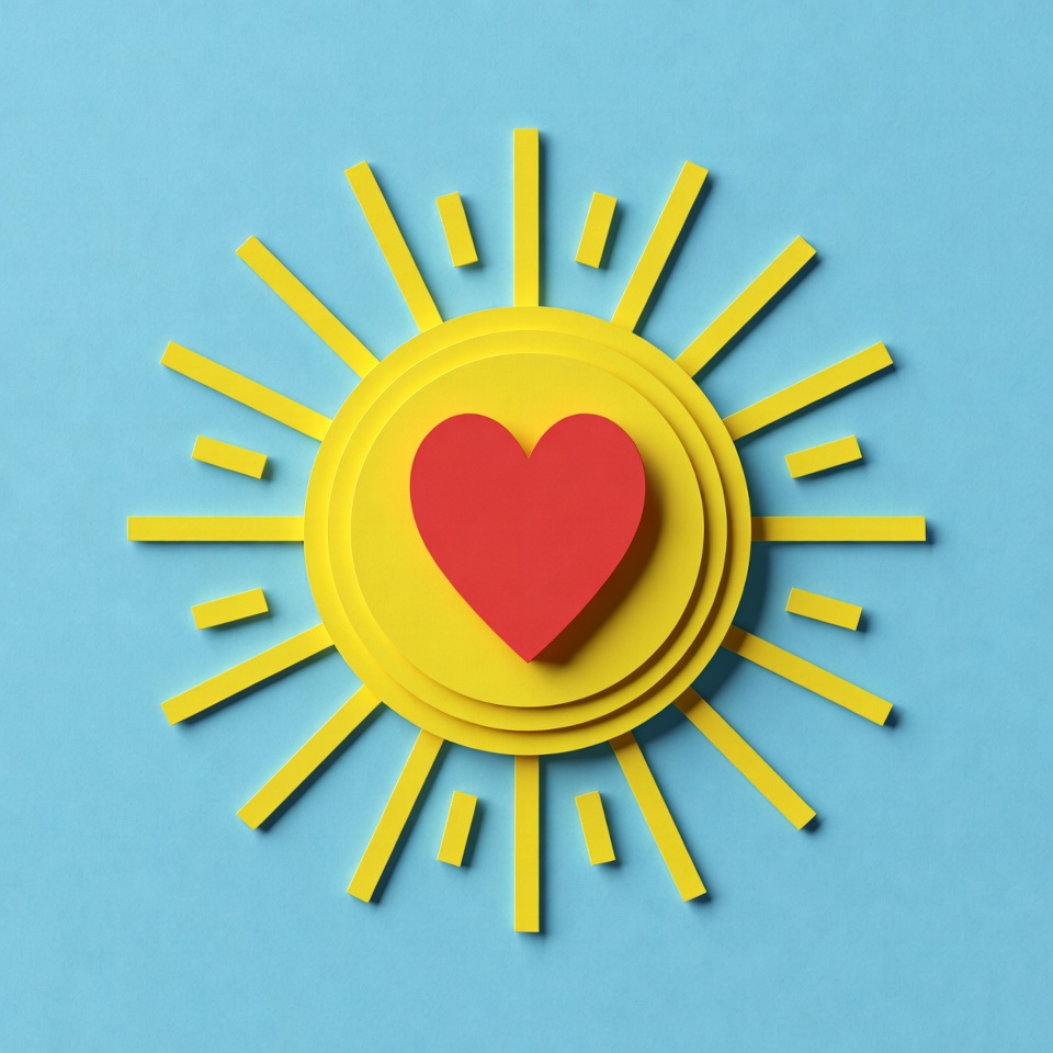 A vibrant red heart sits at the center of a layered yellow sun with radiating rays on a solid blue background. The design features a papercraft style with multiple circular layers forming the sun. The elements are brightly colored and isolated against the smooth blue backdrop.