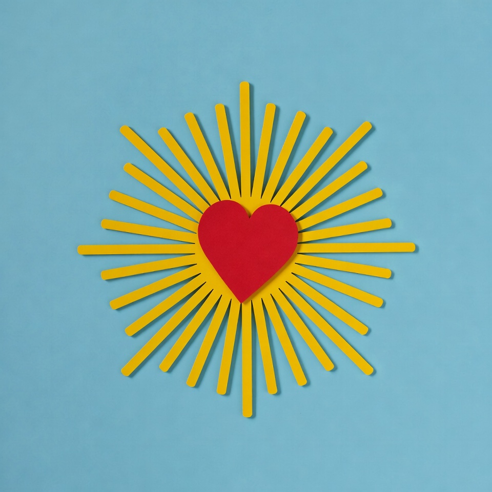 A vibrant red heart sits at the center of a yellow sunburst with radiating spikes. The design is set against a solid blue background. The elements appear to be cut out paper or clipart style.