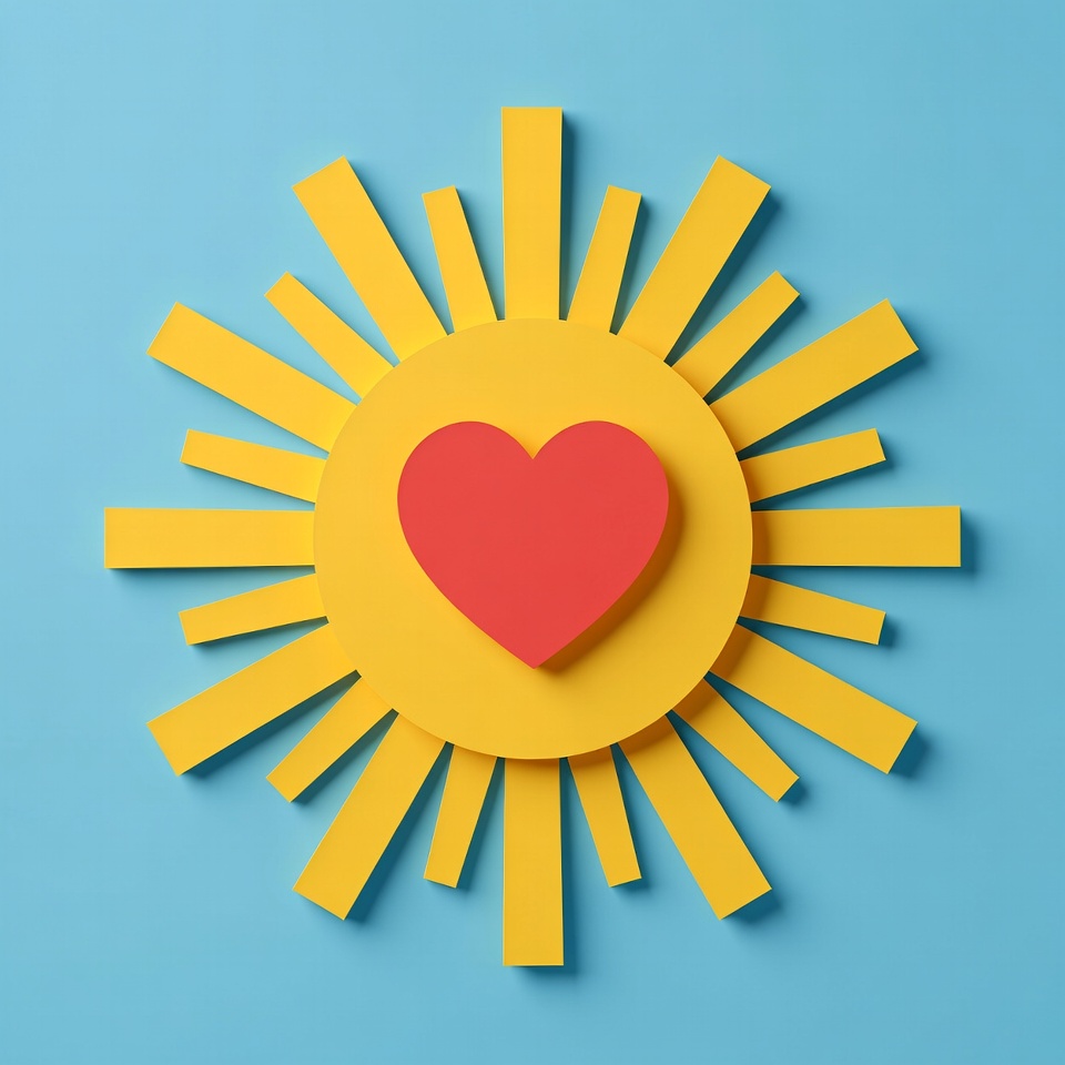 3D design, blue background, clipart, graphic design, illustration, isolated background, love symbol, papercraft, rays, red heart, romantic symbol, sunburst, sunshine heart, vibrant colors, yellow sun, heart