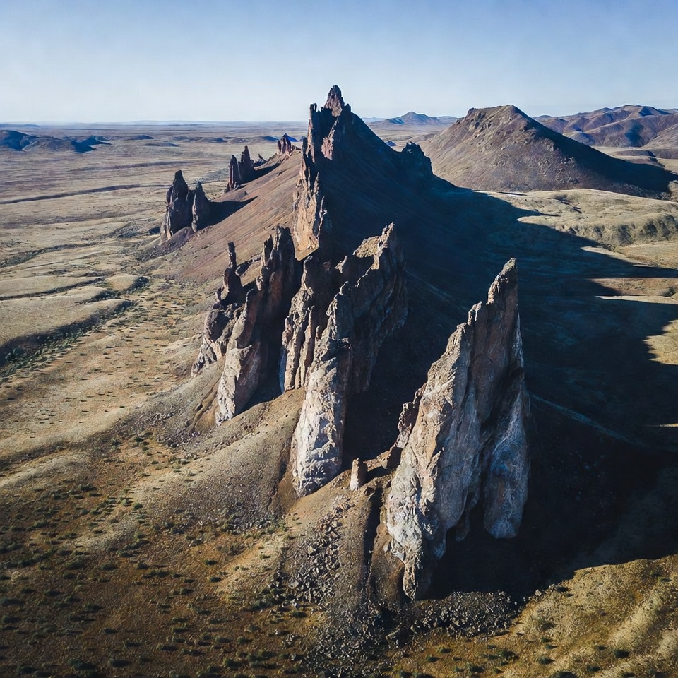 Dramatic cluster of tall, jagged rock spires rises from a vast, arid desert plain under a clear blue sky. The rugged formations feature layered red and gray stone, surrounded by expansive sandy terrain and distant hills. Sparse vegetation dots the foreground and slopes.