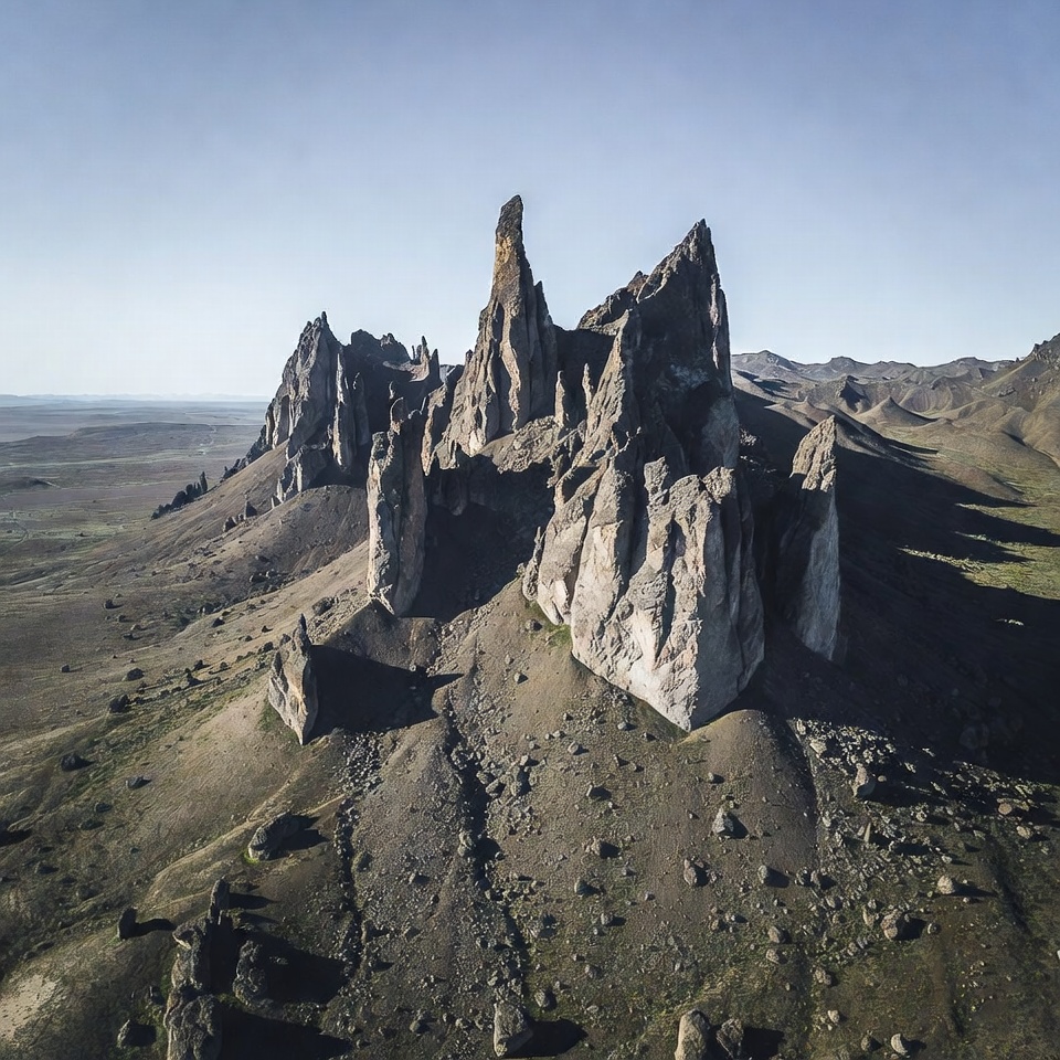 aerial photo, arid terrain, barren plain, blue sky, cliffs, desert landscape, dramatic, drone view, earth, earthy tones, erosion, geology, jagged rocks, landscape, mountains, nature, outcrops, peaks, remote, ridges, shadows, sky, spires, wilderness, rock formations