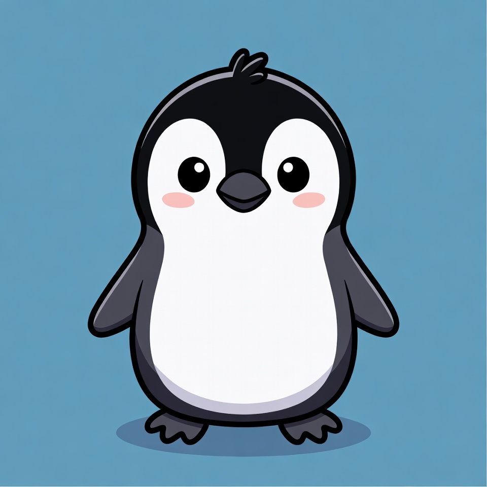 A kawaii-style cartoon penguin stands on a solid blue background. It features black and white feathers, large sparkling eyes with pink blush marks, and a small orange beak. The chibi penguin has a plump body and tiny feet.