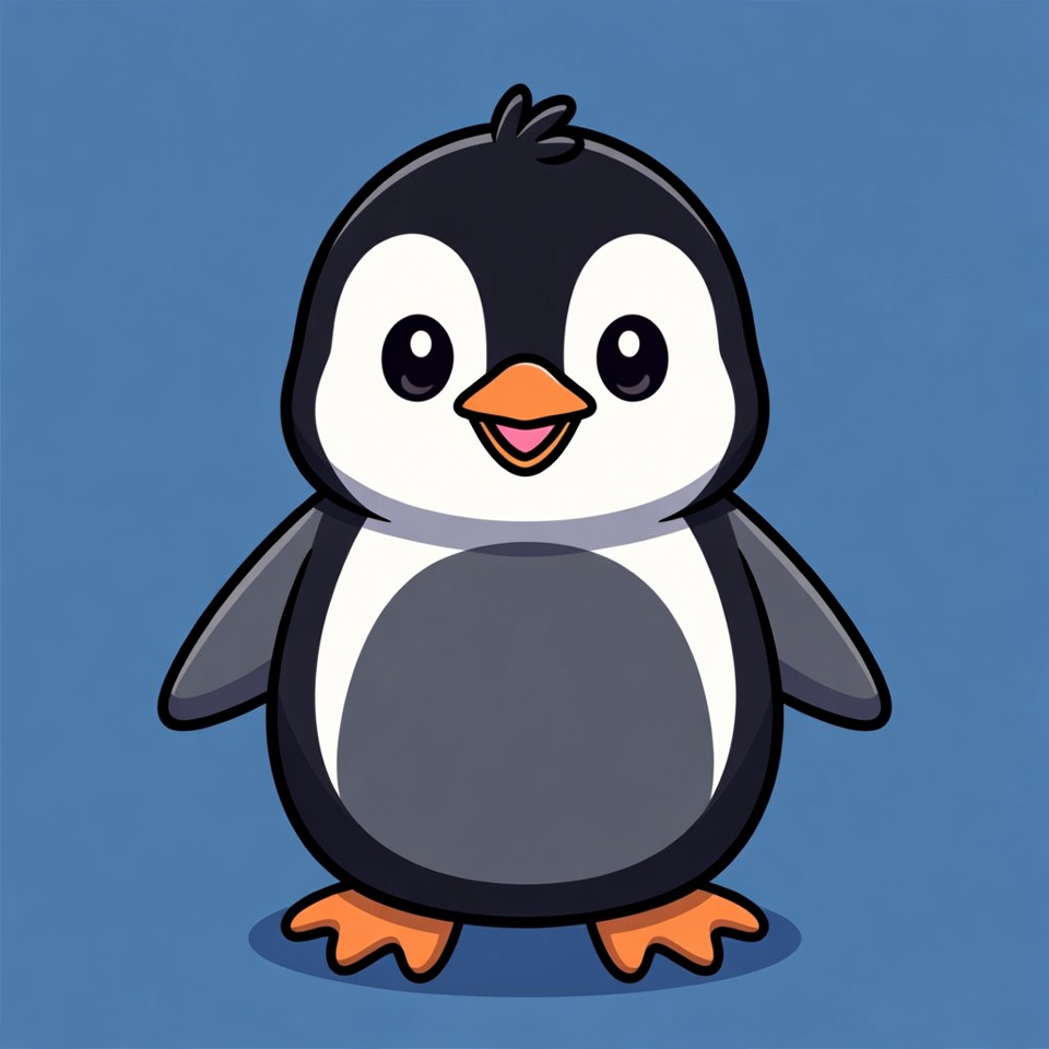 A cute cartoon penguin stands on a blue background with big sparkling eyes and a smiling beak. It has black feathers on its head and back, white belly, and orange feet. The illustration features a chubby body and simple, cheerful design.