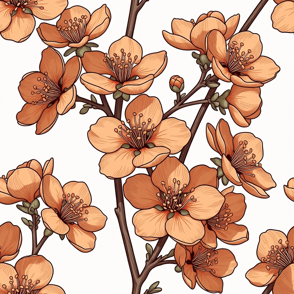 A detailed illustration features multiple orange peach-colored blossoms on thin branches with green leaves. The flowers have delicate petals and prominent stamens, arranged in a clustered composition. The artwork is set against a clean white background.