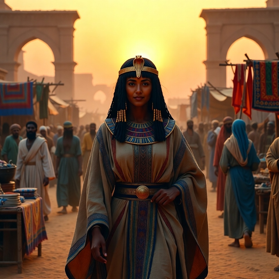 Black woman, Middle Eastern men, Middle Eastern women, ancient Egypt, ancient marketplace, braided hair, bustling crowd, cobra headdress, colorful fabrics, female, golden belt, headscarves, historical scene, male, marketplace stalls, ornate gown, pottery, robes, sandy ground, stone arches, sunset, Egyptian queen