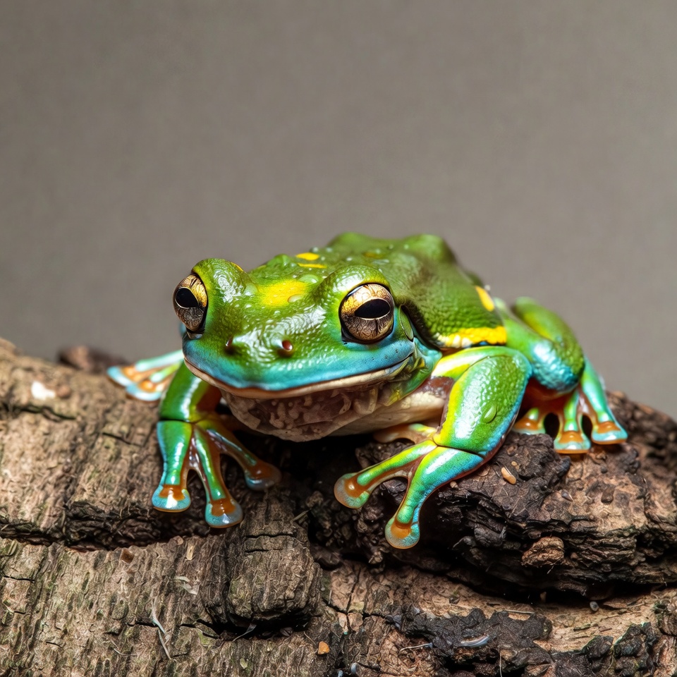 amphibian, animal, blue accents, branch, colorful frog, frog, green frog, isolated background, large eyes, macro photo, mossy branch, nature, wildlife, yellow spots, tree frog