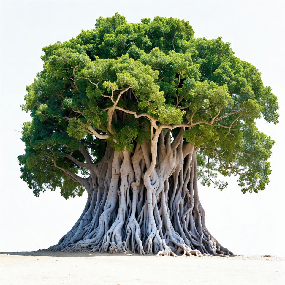 A large banyan tree stands prominently against a white background with its thick, twisting aerial roots exposed at the base. The tree features a dense canopy of vibrant green leaves and a sturdy trunk merging into numerous pale roots. The roots spread out widely, creating a striking, elevated structure on sandy ground.