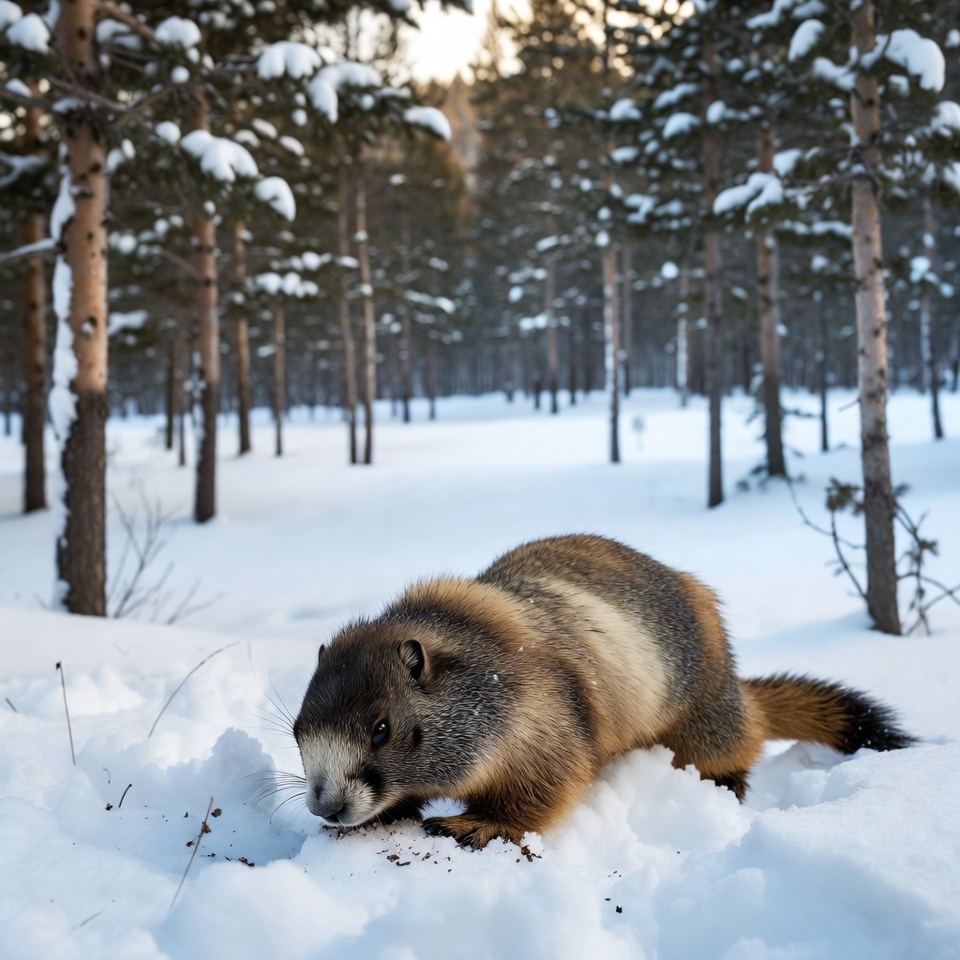 A fisher mammal with brown, white, and orange fur crouches in deep snow, digging with its front paws. Snow-covered pine trees surround it in a winter forest with golden sunlight filtering through. The animal's bushy tail trails behind as it focuses on the ground.