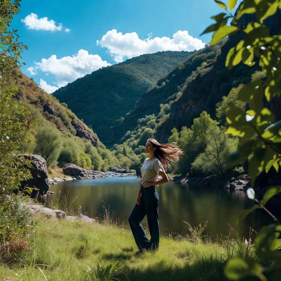 A woman with long brown hair blowing in the wind stands on grassy terrain beside a calm river. She wears a white t-shirt and wide-leg pants, posing with one hand on her hip. Lush green mountains and trees frame the scenic valley under a clear blue sky.
