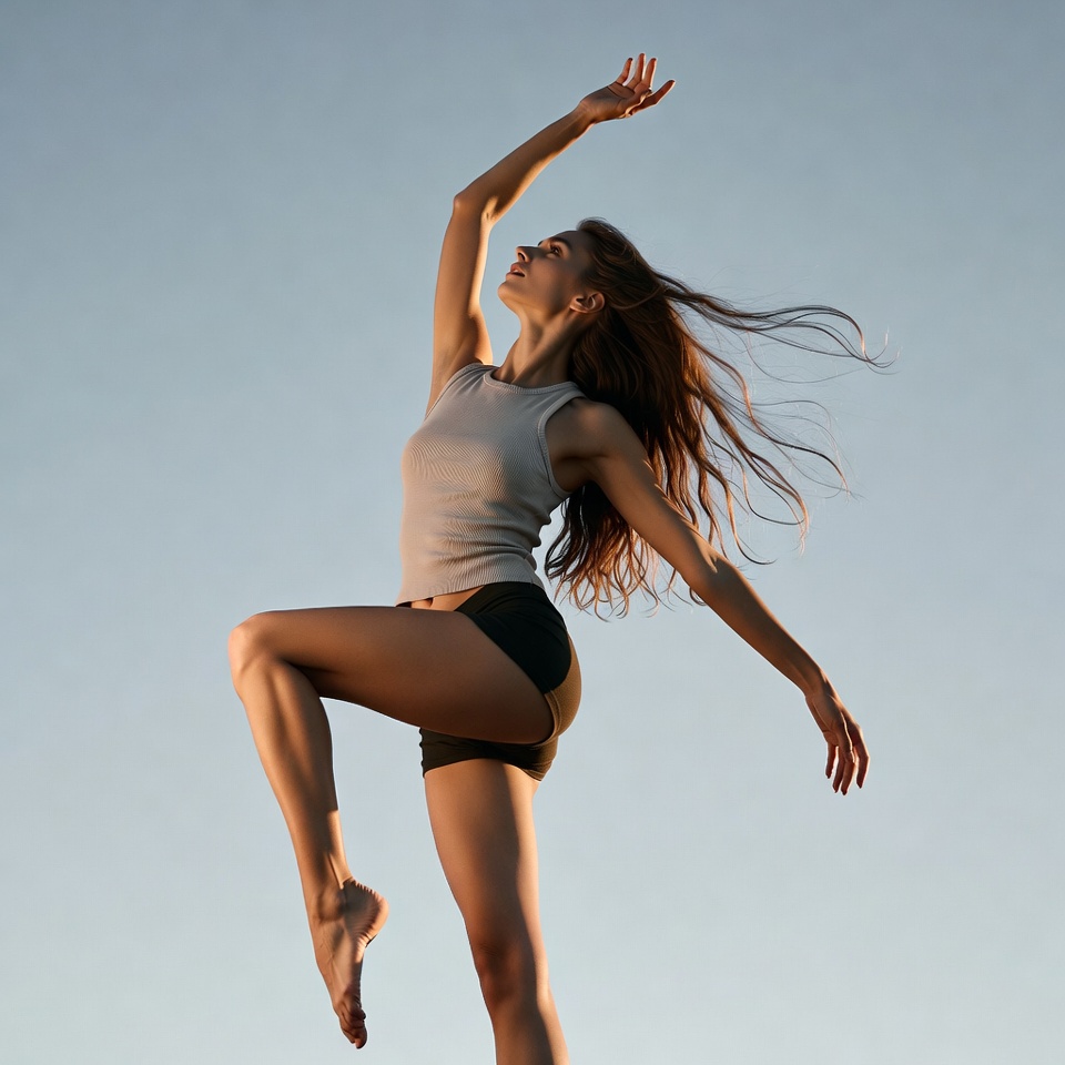 A woman with long brown hair performs a dynamic dance pose against a clear blue sky. She wears a gray tank top and black shorts, with one leg lifted high and arms extended elegantly. Her bare foot points gracefully as her hair flows in the motion.