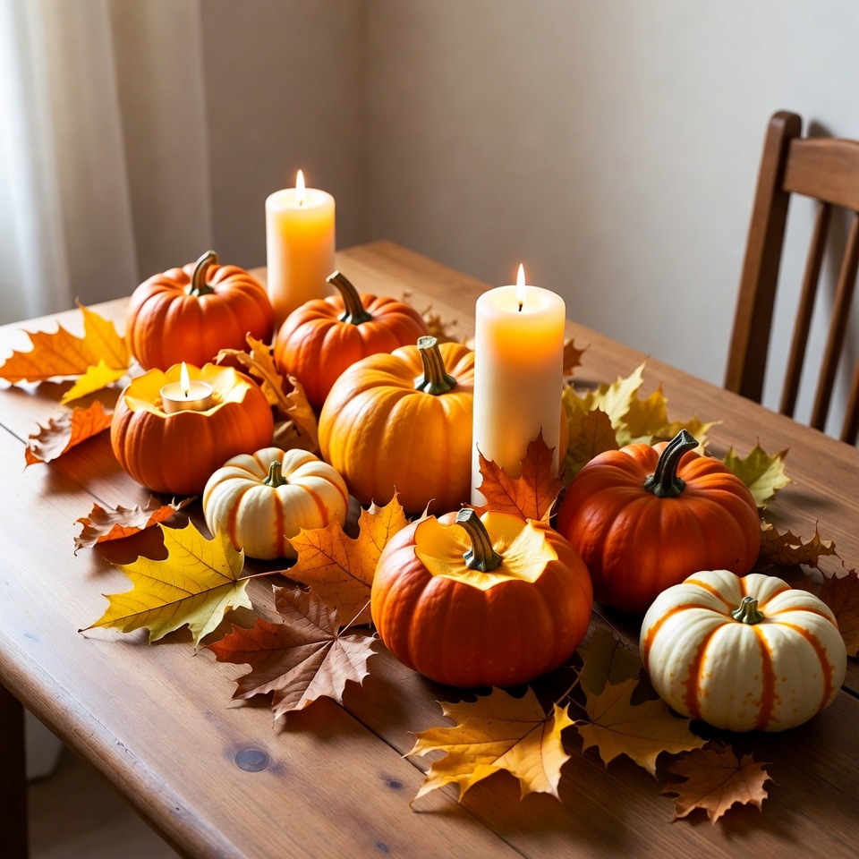 Pumpkins and Candles on Wooden Table
