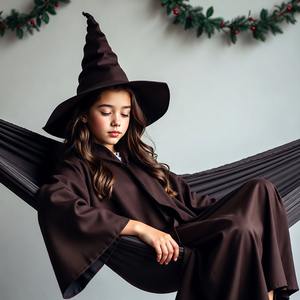 A young girl with long brown hair wears a black pointed witch hat and matching robe while lounging in a hammock. She has a serene expression with closed eyes and flushed cheeks. Green holly garlands with red berries decorate the background.