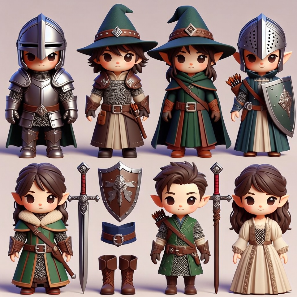 3D render, belts, boots, bows, cloaks, cute elves, elf archer, elf family, elf mage, elf warrior, fantasy characters, fantasy props, green hats, helmets, illustration, isolated background, large eyes, medieval armor, pointed ears, shields, swords, chibi elves