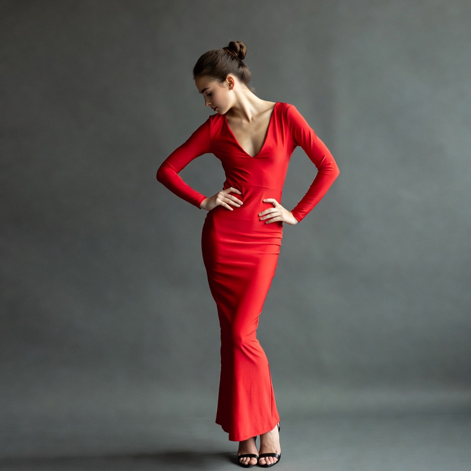 A woman with dark hair in a bun stands on a gray background wearing a form-fitting long red dress with a deep V-neckline and long sleeves. She poses with hands on hips, head tilted slightly, and one leg extended. She wears black high-heeled sandals.
