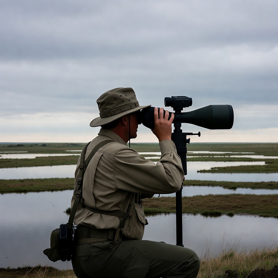 A man wearing a khaki shirt, pants, and wide-brimmed hat kneels while peering through a large spotting scope on a tripod. He has shoulder straps and a camera bag. The background features a vast wetland landscape with marshes, water pools, and overcast skies.