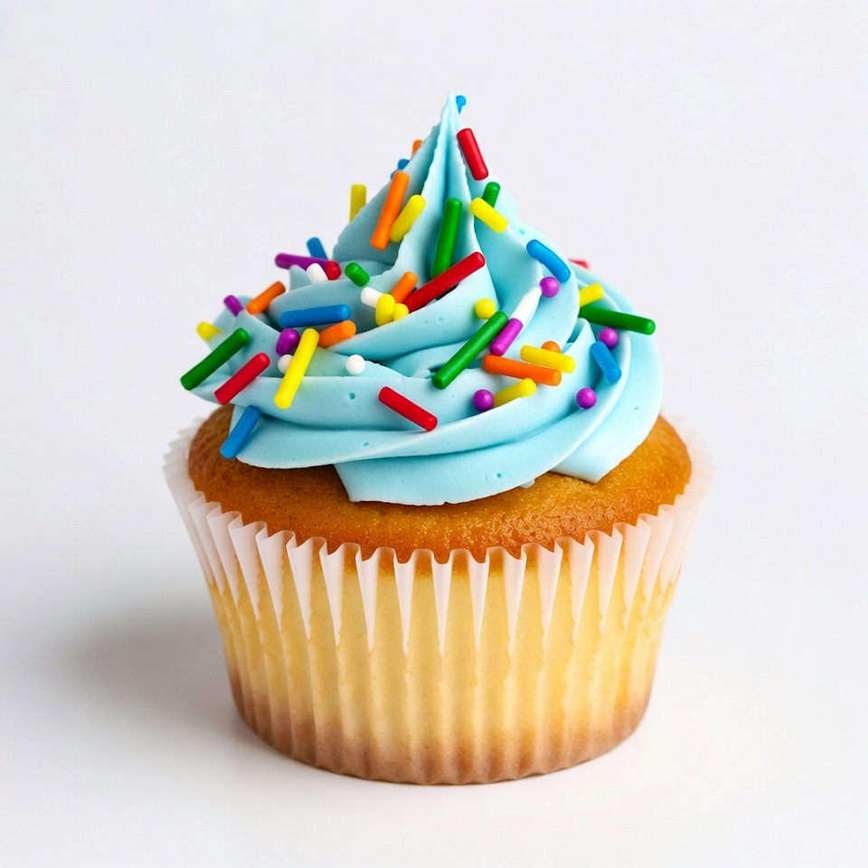 baked good, blue frosting, colorful sprinkles, dessert, food photography, frosting swirl, isolated background, party food, pastry, rainbow sprinkles, sweet treat, vanilla cupcake, white background, cupcake
